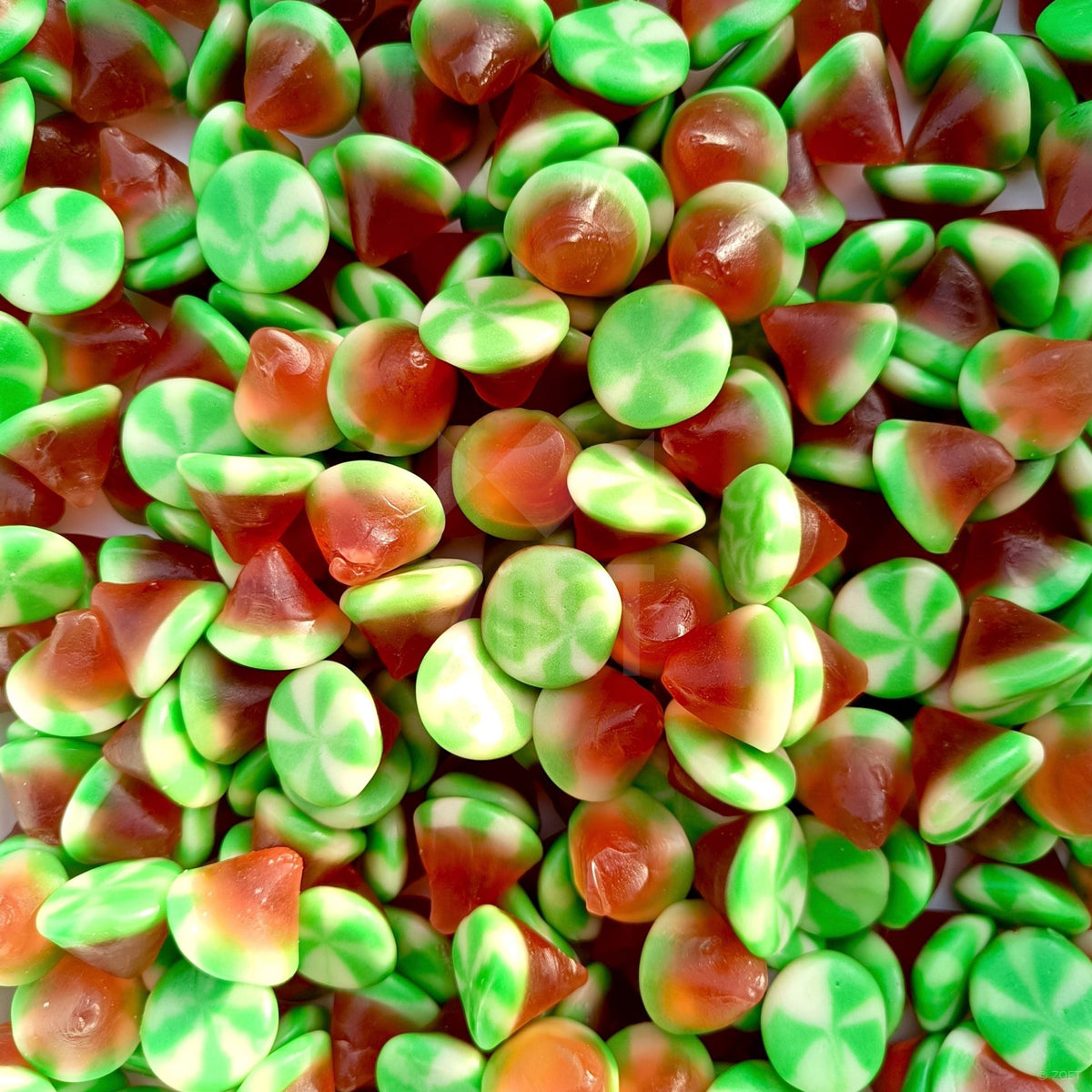 Gekleurde torentjes met een groene onderlaag en rode topje.